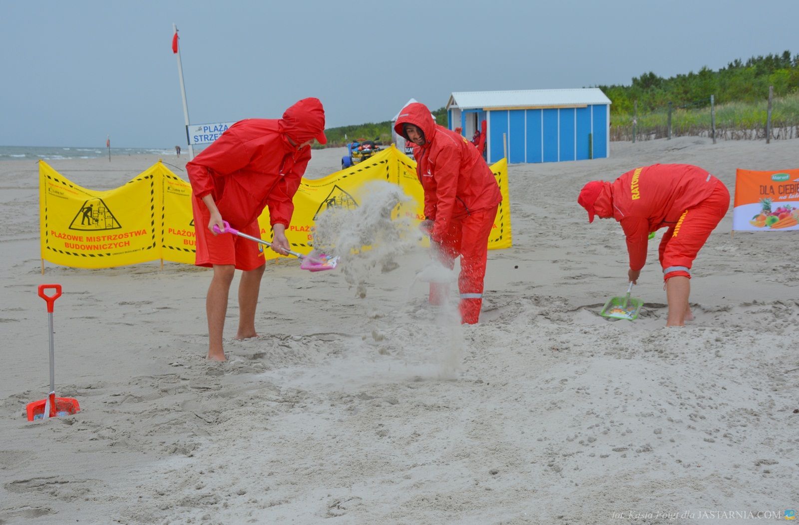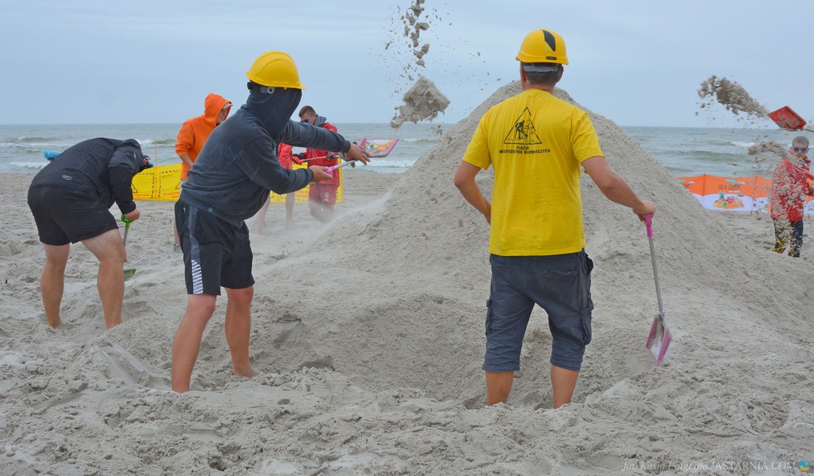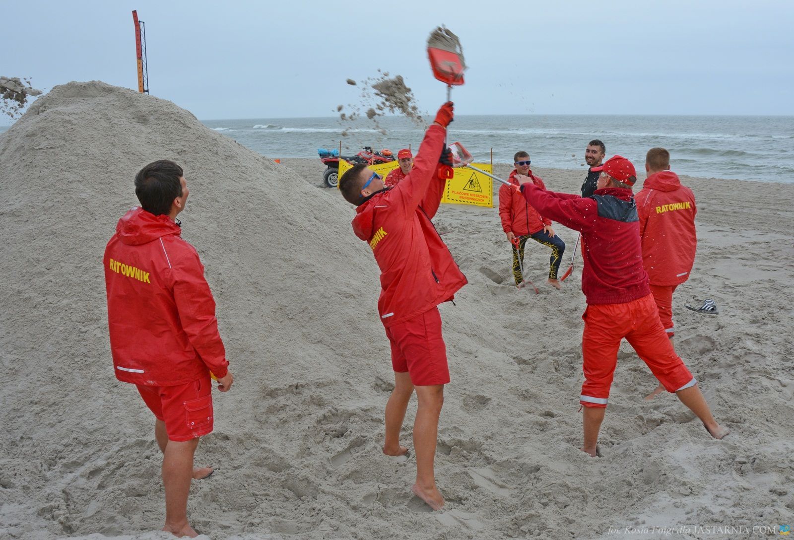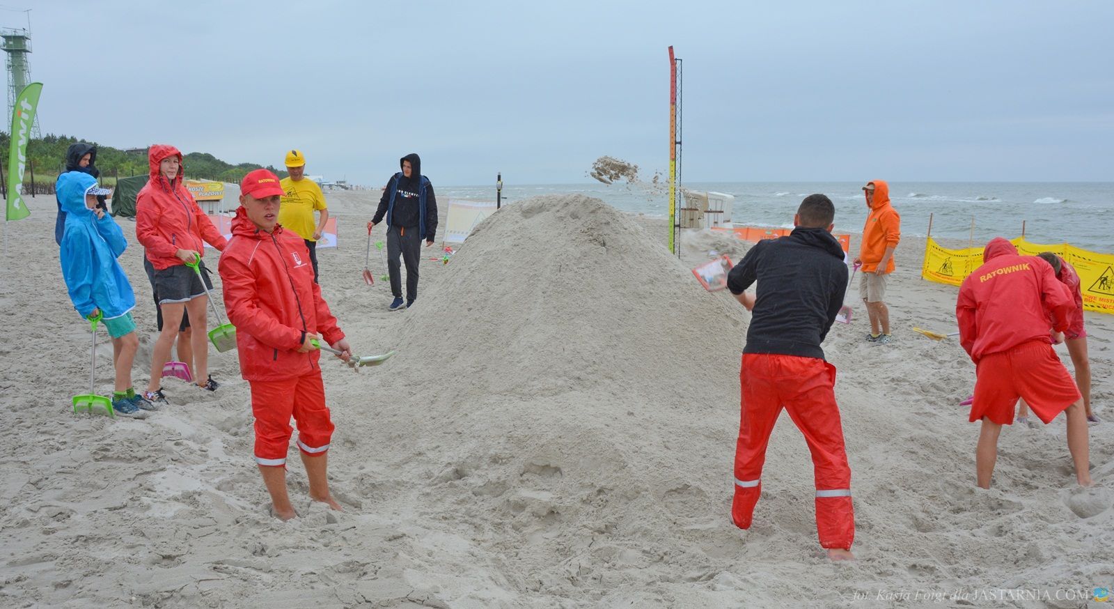W budowaniu uczestniczyli zwarci i gotowi do zabawy ratownicy WOPR z tutejszej plaży oraz dwoje spacerowiczów, którzy mimo deszczowej aury wybrali się nad morze. Pomagali im inżynier Janusz i brygadzista Sławek.