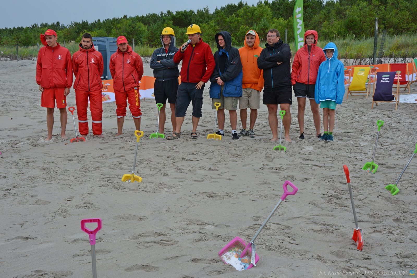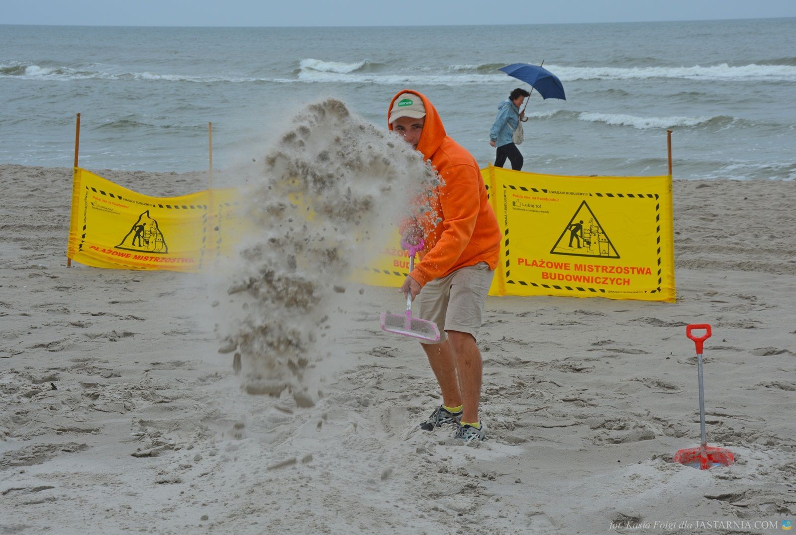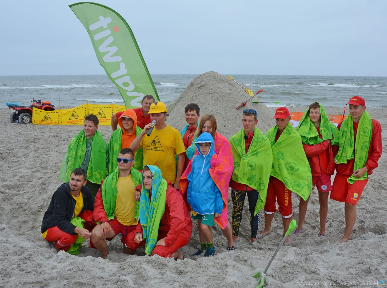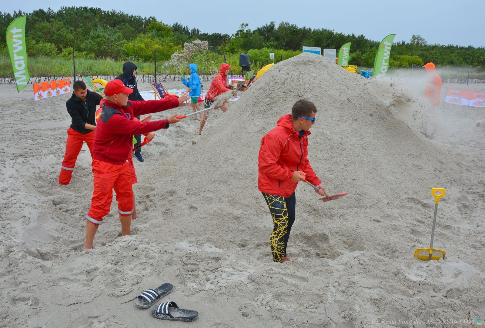 W budowaniu uczestniczyli zwarci i gotowi do zabawy ratownicy WOPR z tutejszej plaży oraz dwoje spacerowiczów, którzy mimo deszczowej aury wybrali się nad morze. Pomagali im inżynier Janusz i brygadzista Sławek.