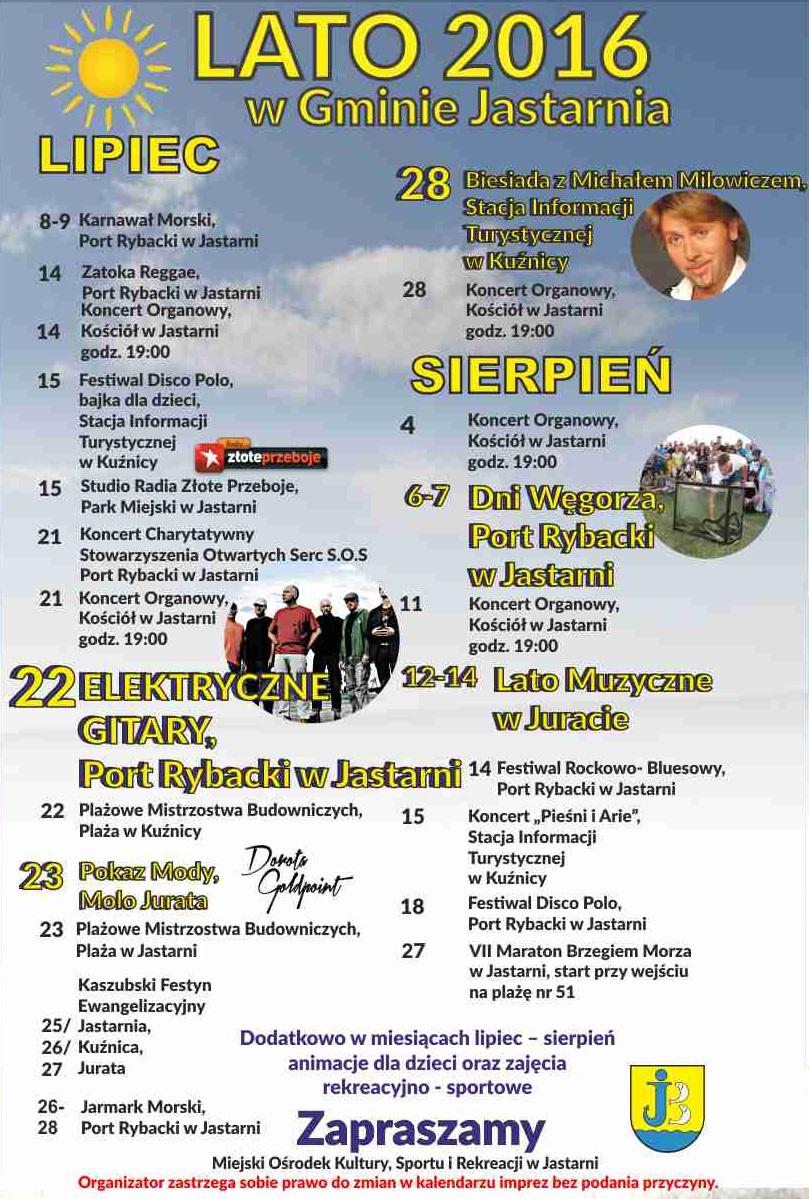 W ciągu najbliższych dwóch miesięcy Gmina Jastarnia przygotowała dla turystów wiele atrakcji. W lipcu będziemy mieli okazję wybrać się m.in. na koncerty Elektrycznych Gitar oraz Michała Milowicza, zaś na sierpień zaplanowano takie imprezy jak Dni Węgorza czy Lato Muzyczne w Juracie. Więcej zapowiedzi wydarzeń znajdą Państwo na poniższym plakacie. Serdecznie zapraszamy!